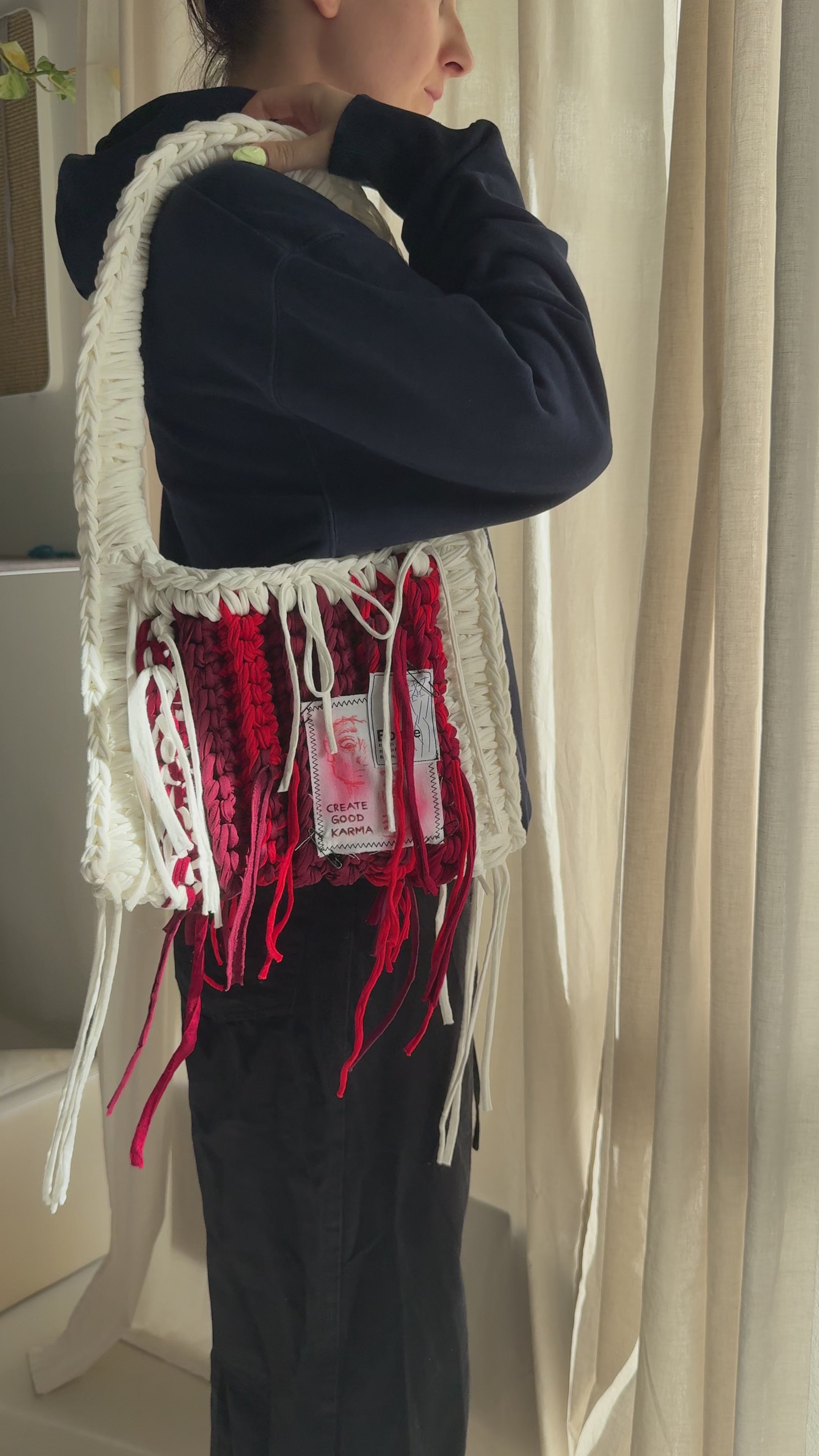 Gefertigt aus recyceltem T-Shirt-Garn, vereint sie Nachhaltigkeit mit kreativem Design.